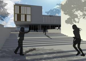 Neubau eines Aulagebäudes mit Räumlichkeiten für die Mittagsbetreuung, Musiksälen und einer Sporthalleneinheit.