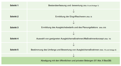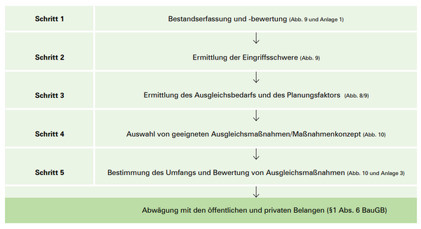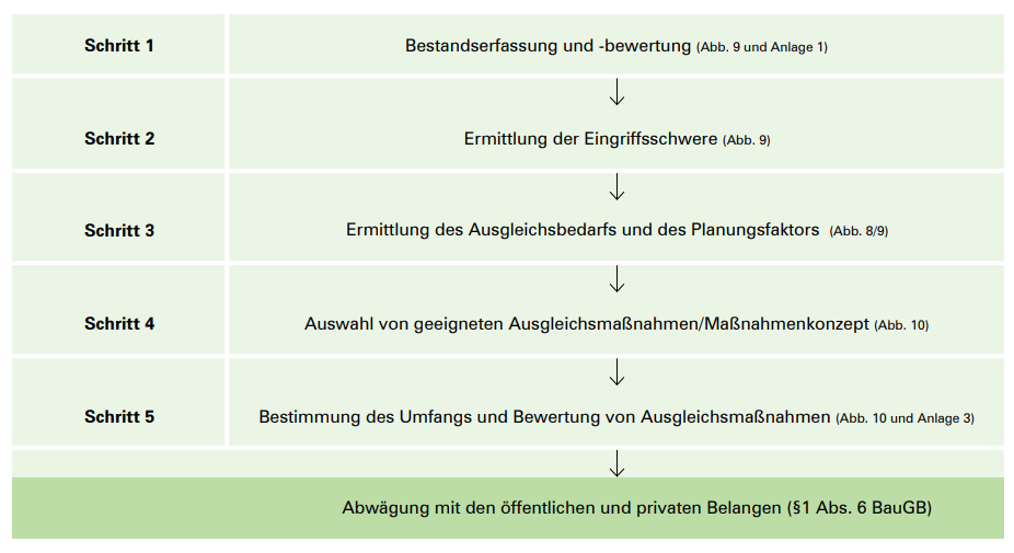 In der folgenden Kurzübersicht wird dargestellt, wie die Eingriffs- und Kompensationsermittlung im Zuge eines Bauleitplanverfahrens abläuft. In diesem Zusammenhang wird auf den Leitfaden des STMUV „Bauen im Einklang mit Natur und Landschaft“ verwiesen, der voll umfänglich alle relevanten Gesichtspunkte des Naturschutzes im Rahmen der Bauleitplanung darstellt.