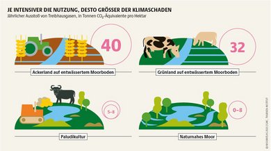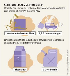 Wurde ein Moor allerdings entwässert, zersetzt sich der dann belüfteten Torf und der über Jahrtausende darin gebundene Kohlenstoff wird in Form von Kohlendioxid (CO2) und anderen klimaschädlichen Gasen wie Methan (CH4) und Lachgas (N2O) frei. Das Moor wird zur Kohlenstoffquelle.