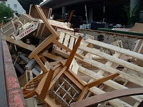 Holz wird in einem Container gesammelt und verwertet. Bei den beiden Stühlen handelt es sich um Fehleinwürfe. Stühle, die nicht aus reinem Holz sind, gehören in den Sperrmüllcontainer.