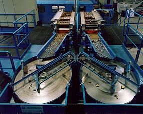 Vor dem Einschmelzen müssen Fehleinwürfe aus dem Glas aussortiert werden. Im Bild wird gerade Glas bei einer Sortieranlage angeliefert.