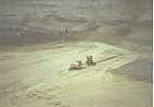 Die Deponie wird nach und nach mit Hausmüll und hausmüllähnlichem Müll von Firmen aufgefüllt. Ein Müllfahrzeug wird gerade entleert. Der Müll wird anschließend von den beiden "Raupen", sogenannten Kompaktoren, verteilt und verdichtet.