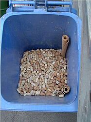 Korkprodukte werden in einer Tonne auf dem Wertstoffhof gesammelt.