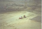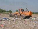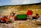 Die Deponie wird nach und nach mit Hausmüll und hausmüllähnlichem Müll von Firmen aufgefüllt. Ein Müllfahrzeug wird gerade entleert. Der Müll wird anschließend von den beiden "Raupen", sogenannten Kompaktoren, verteilt und verdichtet.