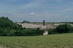 Links ist der bereits rekultivierte Teil der Deponie sichtbar, rechts der aktive Teil. Bei den beiden Türmen handelt es sich um Sickerwasserschächte. Sie werden benötigt, um die auf dem Boden der Deponie befindlichen Sickerwasserrohre reinigen und überprüfen zu können.