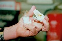 Alte Gefriertruhen enthalten als Lichtschalter manchmal noch sogenannte Quecksilberschalter. Ein großer Quecksilbertropfen schließt darin die elektrischen Kontakte. Diese Schalter werden von Hand ausgebaut.