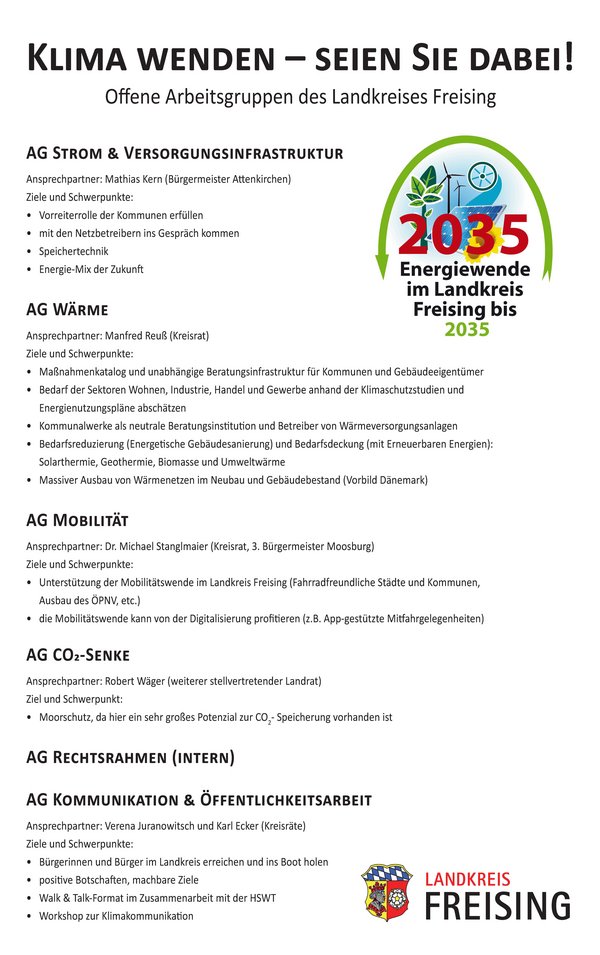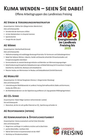 Die Arbeitsgruppen treffen sich seit Anfang 2023 regelmäßig, knüpfen an die Ergebnisse der Klimakonferenz an und werden dabei von den Energiebeauftragten des Landratsamts Freising unterstützt. Ihre erarbeiteten Vorschläge und Maßnahmen fließen anschließend in die Entscheidungsprozesse des Landkreises ein – mit dem Ziel, die Energiewende im Landkreis Freising effektiv und praxisnah voranzutreiben.