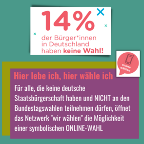 Für alle, die keine deutsche Staatsbürgerschaft haben und NICHT an den Bundestagswahlen teilnehmen dürfen, öffnet das Netzwerk „wir wählen“ die Möglichkeit einer symbolischen ONLINE-WAHL.