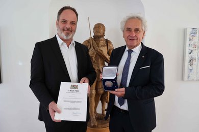 In Vertretung des bayerischen Staatsministers des Innern, für Sport und Integration, Joachim Herrmann, überreichte Landrat Helmut Petz Freisings Oberbürgermeister Tobias Eschenbacher am Mittwoch die Medaille für besondere Verdienste um die kommunale Selbstverwaltung in Bronze. Eine Aufgabe, die der Landrat ausgesprochen gerne übernommen hat.