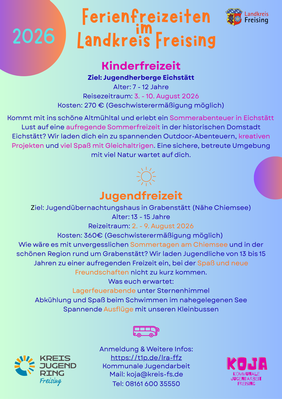 Die Plätze für die begehrten Freizeiten sind begrenzt. Eltern und Erziehungsberechtigte aus dem gesamten Landkreis können ihre Kinder ab sofort anmelden. Weitere Informationen zu diesen Freizeiten und die Anmeldeformulare sind auf der Homepage des Landratsamtes Freising unter https://lrafs.de/ferienfreizeiten zu finden oder bei der Kommunalen Jugendarbeit des Landratsamts unter Telefon 08161/600-3555 oder per E-Mail an koja@kreis-fs.de erhältlich.