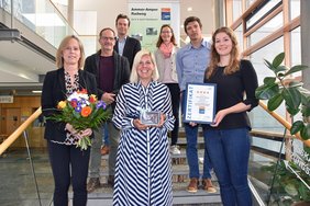 BU (v.l.): Bei der Überreichung des Zertifikats: Petra Husemann-Roew (Landesgeschäftsführerin des ADFC Bayern), Andreas Schmid (stellv. Geschäftsführer Tourismusverband Pfaffenwinkel), Rainer Mahl (Leiter Tourismus, Sport und Wirtschaftsförderung im Landkreis Landsberg am Lech), Julia Kiendl (Tourismusbeauftragte des Landratsamts Fürstenfeldbruck), Martina Mayer (Tourismusbeauftragte des Landratsamts Freising), Arvis Robalds (Produktmanager Ammergauer Alpen GmbH) und Laura Raich vom Regionalmanagement Bett+Bike Bayern.
