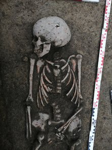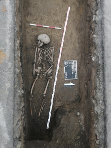 Unterdessen wurde auch in Moosburg erneut ein Skelett gefunden. Seit Beginn dieser Woche laufen die Bauarbeiten zur Erneuerung der Wasserleitung auf dem Plan. Schon auf den ersten Metern dokumentierten die Archäologen Reste von zwei Öfen und eine spätmittelalterliche Grube. Am Mittwoch trat dann auch ein erstes Skelett im Schacht zu Tage. Die Grabgrube lag fast vollständig in der Flucht des Leitungsgrabens und so konnte das Skelett im Ganzen geborgen werden. „Die Knochen sind sehr gut erhalten. Sogar Kniescheibe, Brustbein und Schulterblätter sind noch da, das kommt sehr selten vor“, sagte Grabungsleiterin Bianca Grün. Im Schulterbereich fanden die Archäologen ein kleines Bronzefragment, dessen Funktion noch unbekannt ist. „Es handelt sich vermutlich um einen jungen Menschen, etwa aus dem 16. Jahrhundert.“ Genaue Untersuchungen aber übernimmt eine Antropologin.
