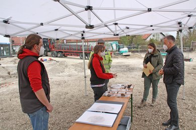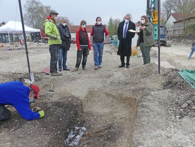 Landrat Helmut Petz und Bürgermeister Franz Heilmeier ließen sich vor Ort die Spuren des alten Neufahrn zeigen. „Archäologie begeistert mich. Wenige Zentimeter unter der Erdoberfläche entdecken wir verborgene Welten, die uns unsere kulturellen Wurzeln unmittelbar vor Augen führen“, sagte Landrat Petz. Kreisarchäologin Delia Hurka und die Grabungsleiter Sikko Neupert, Bernhard Grün und Bianca Grün führten die interessierten Politiker zusammen mit dem ortskundigen Vorsitzenden des Heimat- und Geschichtsvereins Neufahrn, Ernest Lang, über die Fläche, auf der noch zahlreiche Relikte der über Tausend Jahre alten Siedlung erhalten sind.
