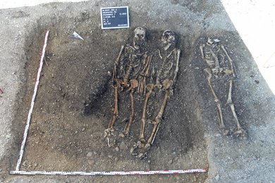 Ebenfalls in das Bild dieser Zeit passen drei beigabenlose, west-ost-ausgerichtete Bestattungen. Es handelt sich um eine Frau und zwei Männer, die als Hofgrablegen mitten im Siedlungsbereich beigesetzt worden waren. Erst mit Beginn des frühen Mittelalters setzten sich langsam die christlichen Glaubensvorstellungen und damit verbundene, nach West-Ost ausgerichtete Körperbestattungen in gestreckter Rückenlage durch. Im weiteren Verlauf des Mittelalters verlagerten sich dann die Friedhöfe hin zu den frühen Ortskirchen. Bemerkenswert ist die Lage zweier Verstorbener, deren Kopf und Füße deutlich höher lagen als der mittlere Körperbereich. Vielleicht wurden sie auf einem Totenbrett beigesetzt und rutschten nach dessen Verrottung in darunterliegendes, lockereres Erdreich nach.