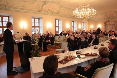 „Heute ist ein denkwürdiger Tag“, sagte Landrat Hauner bei dem Festakt am 8. Oktober im Großen Sitzungssaal des Landratsamts. Mit „einem lachenden und einem weinenden Auge“ lasse man Rudolf Goerge ziehen, der den Landkreis geprägt hat. „Ich wollte die Menschen begeistern für die weit zurückreichende Geschichte und Kultur unserer Dörfer und Städte, für die vielfältige Landschaft, für die kirchlichen und weltlichen Bräuche, die Mundart, Sagen, Legenden und Schwänke“, sagte Goerge.