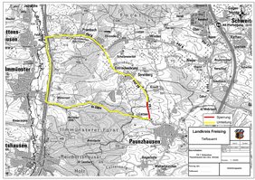 Der Landkreis Freising saniert die Fahrbahn der Kreisstraße FS 1 bei Paunzhausen. Die Maßnahme umfasst den kompletten Deckenbau und die Tragschicht vom Kreuzungsbereich der FS 1 mit der Staatsstraße 2084 bis zur Landkreisgrenze Pfaffenhofen in Richtung Entrischenbrunn. Die Bauarbeiten finden von 7. Juni bis voraussichtlich 1. Juli. In diesem Zeitraum ist die Kreisstraße für den gesamten Verkehr voll gesperrt und wird großräumig umgeleitet. Anlieger können die Straße mit Einschränkungen nutzen, um ihre Anwesen zu erreichen.