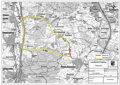 Der Verkehr wird an der Abzweigung Richtung Letten über die Bundesstraße 13 via Prambach in Richtung Entrischenbrunn umgeleitet. Die Umleitung für die Gegenrichtung erfolgt analog. Die Umleitungsstrecke ist ausgeschildert. Der Umleitungsfahrplan für den MVV wird ausgehängt und unter www.mvv-muenchen.de abrufbar sein.