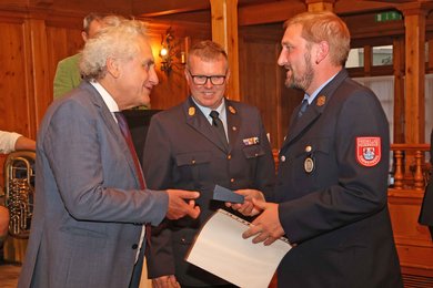 Der Landrat dankte den Feuerwehrleuten dafür, dass sie zu jeder Tages- und Nachtzeit ihren Mitmenschen zur Hilfe eilen, obwohl diese Arbeit nicht selten mit Gefahren verbunden sei und sie dafür oftmals auf gemütliche Stunden mit der Familie verzichten würden. „Ihr seid unermüdlich im Dienste der Feuerwehr – mit Mut, Engagement und Verantwortungsgefühl“, sagte Kreisbrandrat Manfred Danner. „In einer sich ständig verändernden Welt ist es beruhigend zu wissen, dass wir uns auf euch verlassen können.“ Landrat Petz: „Diese Ehrenzeichen sollen ein Symbol der Anerkennung und Wertschätzung für Sie sein.“