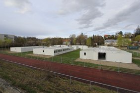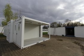 Die Anlieferung der Container zum ehemaligen Sportgelände des Camerloher-Gymnasiums startete mit dem Beginn der Osterferien, mittlerweile erstellt eine Fachfirma die fünf Gebäude auf dem eingezäunten Areal in erdgeschossiger Modularbauweise.