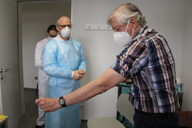 Bereits am frühen Morgen herrschte dabei ein relativer Andrang vor dem Impfzentrum: Die Besucher hielten allerdings große Abstände ein und trugen schon draußen Masken. Dass es überhaupt zu Warteschlangen kam, lag indes nicht daran, dass das Aufklärungsgespräch durch den Arzt jeweils viel Zeit in Anspruch nimmt. Der Ablauf im Impfzentrum war gut organisiert und laut BRK-Geschäftsführer Albert Söhl waren die Einsatzkräfte mit ihrer Arbeit entsprechend „gut in der Zeit“. Die Warteschlange draußen hatte vielmehr einen anderen Hintergrund. „Viele Menschen kommen eine Viertelstunde zu früh zu ihrem Termin“, so Söhl. Impflinge werden daher dringend darum gebeten, möglichst pünktlich zum Impfzentrum zu kommen.