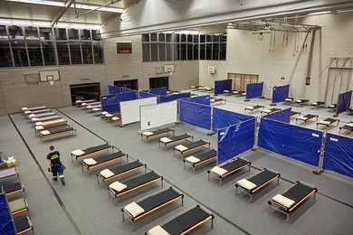 BRK und Johanniter lieferten inzwischen bereits 140 Feldbetten und stellten diese auf. Mithilfe von Trennwänden wurde die Halle in drei Abschnitte geteilt und einige Betten zu abgetrennten Bereichen zusammengefasst. Je nachdem, wie viele Personen einer Familie hier unterkommen, kann die Bettenzahl variiert werden. „Wir wollen hier Nischen schaffen, damit die Menschen wenigstens etwas Privatsphäre haben können“, erläutert Wagensonner. Für die Kinder wurde eine Spielecke eingerichtet.