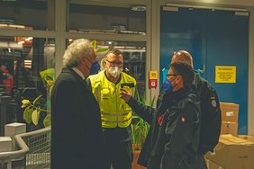 Unterdessen errichteten die Kräfte des THW einen Bauzaun um die Halle herum und einige BRK-Helfer bauten ein Cateringzelt auf. Parallel dazu richteten die Verantwortlichen in der kleinen Turnhalle der benachbarten Stadthalle eine Erstaufnahmeeinrichtung ein. Dort sollen die Menschen, die mit Bussen zu uns kommen, zunächst ein warmes Dach über dem Kopf haben, registriert und auf Corona getestet werden, ehe sie auf Unterkünfte im Landkreis weiterverteilt werden.