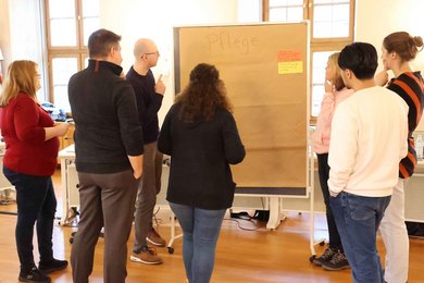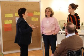 Die zweite Stunde der Sitzung stand ganz unter dem Thema „Vernetzung“. Hier gab es für die Teilnehmer die Möglichkeit, in einen ungezwungenen Austausch zu kommen und Gedanken zu den Handlungsfeldern Gesundheitsversorgung, Gesundheitsförderung & Prävention und Pflege mit den anderen Fachkräften zu diskutieren und auf Pinnwänden festzuhalten.