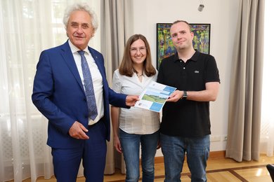 Landrat Helmut Petz (v. l.), Elisabeth Held, Leiterin der Geschäftsstelle Gutachterausschuss, und deren Mitarbeiter Christian Schmiedl präsentieren den ersten Grundstücksmarktbericht für den Landkreis Freising.
