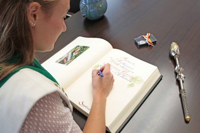 Susanne Kaindl verewigte sich im Goldenen Buch des Landkreises Freising. „Ich freue mich sehr, mich ins Goldene Buch meines Heimatlandkreises eintragen zu dürfen. Es ist mir eine große Ehre, als neue Hallertauer Hopfenkönigin 2022/23 unsere Hallertau, unser grünes Gold und unsere Heimat repräsentieren zu dürfen“, schrieb sie. Seitdem sie ihr Amt antrat, ist Susanne Kaindl viel unterwegs – innerhalb des Landkreises bei diversen Volksfesten und sonstigen Veranstaltungen, aber auch darüber hinaus. Beim Trachten- und Schützenzug im Rahmen des Oktoberfests in München ist sie als Mitglied der Marktkapelle Au schon öfter dabei gewesen, diesmal durfte sie als Hallertauer Hopfenkönigin in der Kutsche der Bayerischen Bierkönigin mitfahren. Im Oktober geht es nach Slowenien, im Januar 2023 zur Grünen Woche nach Berlin und im Mai 2023 sogar nach Texas, USA.