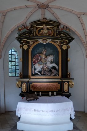 Der heilige Georg ist der berühmteste Drachentöter des christlichen Abendlandes, und so wird er auch in der Georgskirche zu Pelka vorgestellt. Auf dem frühbarocken Altar künden Figuren von der Heldentat des Heiligen: Mit flatterndem Umhang sprengt der römische Offizier Georg auf seinem Schimmel über den Drachen hinweg. Georgs Lanze hat bereits das Haupt des Untiers durchbohrt, das niedergestreckt vor ihm liegt. Die Quelle für dieses Bildmotiv ist die bekannteste Episode der Georgsvita. Der Heilige soll demnach im Zeichen des Kreuzes einen Drachen getötet haben. Das Untier hauste vor den Toren der libyschen Stadt Silena und hatte einen unstillbaren Hunger auf Lämmer und Kinder entwickelt.