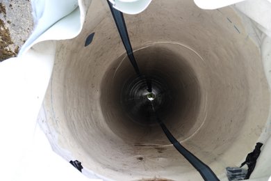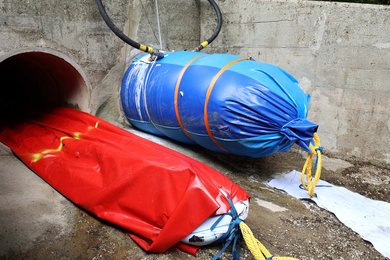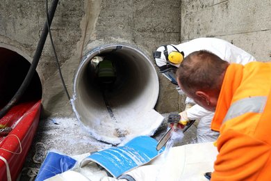 Im Tiefbauamt der Landkreisbehörde hatte man sich für ein sogenanntes Schlauchlining-Verfahren entschieden, das den großen Vorteil einer geringen Bauzeit aufweist. Der hierbei verwendete Synthesefaser-Liner ist flexibel und mit Epoxidharz getränkt. Durch Aufblasen mit heißem Dampf legt er sich optimal an die Rohrinnenwand an und stützt so die gerissenen Betonringe, nachdem er ausgehärtet ist.