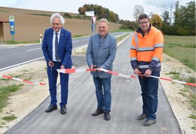 Sicher, komfortabel und umweltfreundlich unterwegs: Der neue Geh- und Radweg entlang der Kreisstraße FS 32 zwischen der Abzweigung nach Tölzkirchen und Schwaig ist offiziell eröffnet. Landrat Helmut Petz, Nandlstadts 1. Bürgermeister Gerhard Betz und Urs Phillip vom Tiefbauamt des Landkreises Freising gaben den Weg nun symbolisch frei.