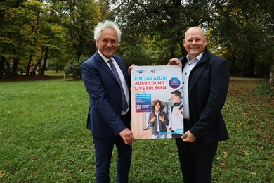Zusammen mit Landrat Helmut Petz wirbt die IHK für den Aktionstag „Ein Tag Azubi“, bei dem am schulfreien Buß- und Bettag (20. November 2024) junge Frauen und Männer im Landkreis Freising aktuellen Auszubildenden über die Schulter schauen und deren Alltag im Betrieb kennenlernen können.