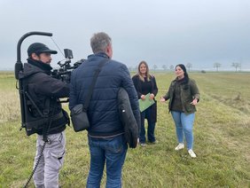Einen weiteren Stopp legte das Drehteam bei einem obertägig erhaltenen Bodendenkmal ein, den Grabhügeln bei Eching. Hierzu erläuterten Hurka und Adaileh die außergewöhnliche Situation für den Denkmalschutz: Diese Bodendenkmäler befinden sich in einem Naturschutzgebiet, das nicht landwirtschaftlich genutzt wird, was sich besonders positiv auf deren Erhalt auswirkt.