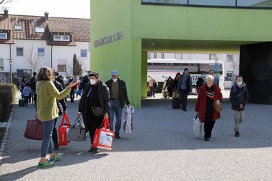 40 Flüchtlinge fuhren am Sonntag mit dem Bus in den Landkreis und bekamen nach ihrer Registrierung und einem Coronatest sowie einer ärztlichen Untersuchung in Moosburg eine erste Unterkunft in der Turnhalle der Imma-Mack-Realschule in Eching zugewiesen. Viele helfende Hände hatten hier alles vorbereitet und versorgten die Flüchtlinge mit Mahlzeiten, Hygienepaketen, Bettwäsche und Kuscheltieren für die Kinder. Mit Stellwänden errichteten sie kleine Familieneinheiten, um etwas Privatsphäre zu schaffen.