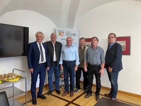 Unser Bild zeigt (v. l.): Landrat Helmut Petz, Alfred Maier, Georg Ball, Korbinian Bauer, Karl Göls und Martin Ernst, Bürgermeister von Marzling.