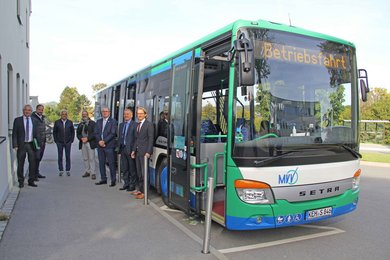 Der neue Expressbus X660 ist in Betrieb. Unser Bild zeigt (v.l.) Landrat Helmut Petz, Freisings Oberbürgermeister Tobias Eschenbacher, Dr. Eric Veulliet, Professor Dr. Harald Luksch (TUM), Jürgen Ascherl (Zweiter Bürgermeister Garching), Franz Heilmeier (Bürgermeister Neufahrn) und Sebastian Thaler (Bürgermeister Eching).