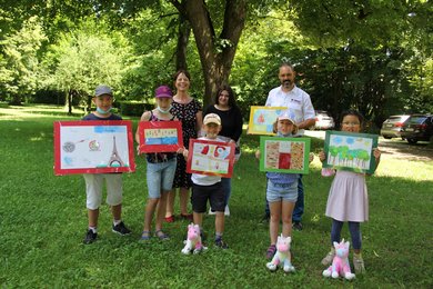 Unter dem Motto „Aussichten“ hatten die Buben und Mädchen Zeichnungen und Aquarelltechnik ausprobiert und kleine Meisterwerke geschaffen. Als Dank gab es für die extra aus Moosburg mit der Bahn angereisten Kinder gab es je ein plüschiges Maskottchen und eine Führung durch die Gebäude durch Kreisheimatpfleger Dr. Bernd Feiler.