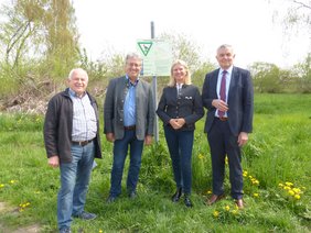 Sebastian Kreitmeier Ortssprecher Thonstetten (v.l.) sowie die Bürgermeister der anliegenden Gemeinden, Anton Geier (Haag), Susanne Hoyer (Langenbach) und Josef Dollinger (Moosburg), vor einem der neuen Hinweisschilder.