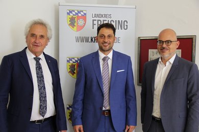 Landrat Helmut Petz begrüßte vor wenigen Tagen den neuen Geschäftsführer der Wohnungsbaugesellschaft des Landkreises Freising mbH (WLF), Mesut Mermer. Der Kreistag des Landkreises Freising hatte sich im Herbst 2021 für eine Fortführung der WLF als 100-prozentige Landkreistochter entschieden, die den Wohnungsbestand des Landkreises und des Klinikums verwalten und durch Neubaumaßnahmen um weitere preisgedämpfte Wohnungsangebote für die Beschäftigten des Landratsamts und für das Klinikpersonal ergänzen soll. Der bisherige Geschäftsführer Florian Plajer hat diesen Umbau mit voller Kraft bis zum 1. Januar 2023 umgesetzt, der Kreistag hat den neuen Aufsichtsrat der WLF im März dieses Jahres nominiert. „Jetzt sind wir am Start. Wir begrüßen Herrn Mermer als neuen Geschäftsführer der WLF und wünschen ihm für die ambitionierte Aufgabe alles Gute“, so Landrat Petz.