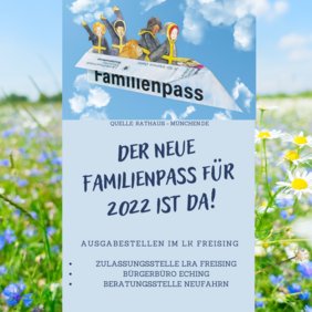 Landkreisbürger können den Familienpass ebenso wie den Ferienpass im Landratsamt Freising sowie in den Gemeinden Eching (Rathaus) und Neufahrn (Beratungsstelle für Kinder, Jugendliche und Erwachsene) erwerben.