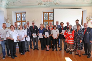 Anschließend durften Petz und Neumaier neben den BRK-Ehrenzeichen auch die Einsatzmedaille „Fluthilfe 2021“ des Bundesinnenministeriums und die rheinland-pfälzische Fluthilfemedaille für deren Einsatz im Ahrtal vergeben. Die Ehrung erhielten Hubert Ammer, Mathias Beth, Christine Frey, Inge Göpfrich, Sarah Haux, Stefan Hoffmann, Monika Knöferl, Felix Pahl, Martin Pahl, Christine Rattenhuber, Florian Strömsdörfer, Robert Sturm, Dr. Birgit Wahl und Lucas Witzel. Nicht anwesend waren Boris Baic, Matthias Kettner und Thomas Rothböck.