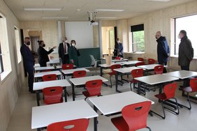 „Damit geht eine Durststrecke zu Ende“, sagte Landrat Petz. Schon seit Jahren herrschte Platznot in der Außenstelle Moosburg, an der die Förderung von Sprache, Lernen sowie emotionaler und sozialer Entwicklung im Zentrum stehen. Unterrichtsräume fehlten, der Gymnastikraum wurde umfunktioniert, eine Klasse wich auf die Kastulus-Realschule aus. Nachdem die Verwaltung des Landratsamts Freising beauftragt worden war, geeignete Lösungen zu suchen, beschloss der Kreistag im Oktober 2019, keine Container aufzustellen, sondern einen Interimsbau, der auf Dauer genutzt werden kann. So kam die Idee des Holzmodulbaus zustande. Dieser ist mit einer Luftwärmepumpe ausgestattet und damit autark und kann – falls er in einigen Jahren nicht mehr gebraucht wird – relativ einfach ab- und andernorts wieder aufgebaut werden.