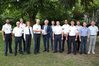 Unser Bild zeigt (v.l.): Johannes Lang (stellvertretender Leiter PI Flughafen), Christian Bidinger (Leiter PI Moosburg), Michael Ertl (Leiter PI Neufahrn), Polizeivizepräsidentin Kerstin Schaller, Polizeipräsident Günther Gietl, Landrat Helmut Petz, Tobias Diepold (stellvertretender Amtsleiter Landratsamt), Ralf Schmidt (Interimsleiter PI Freising), Mithun Küffner (Leiter VPI Freising), Matthias Schäfer (ehemaliger Leiter PI Freising), Lars Tauber (Leiter Verkehrsbehörde Landratsamt), Jan Schuster (Sachgebietseiter Öffentliche Sicherheit) und Robert Winkler (Leiter Büro des Landrats).