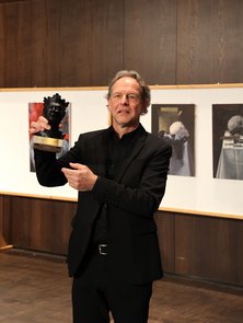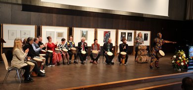 Ifeanyi Christian Okolo steht für Gemälde und vor allem für teilweise überlebensgroße Skulpturen aus Holz, aber auch für eindrucksvolle Musik – vor allem durch seine sensationelle Trommelkunst. Laudator Bernd Feiler bezeichnete ihn als „Kulturkatalysator“.