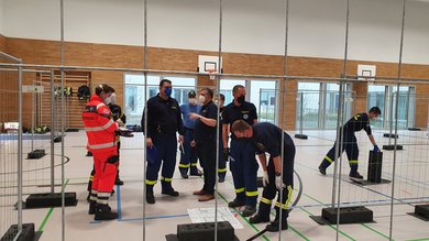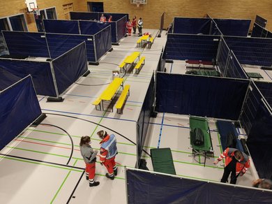 Um für weitere Ankömmlinge gewappnet zu sein und entsprechende Hilfe sicherstellen zu können, organisierte die Führungsgruppe Katastrophenschutz (FüGK) die Einrichtung einer weiteren Notunterkunft, diesmal in Freising in der Turnhalle der Realschule Gute Änger.